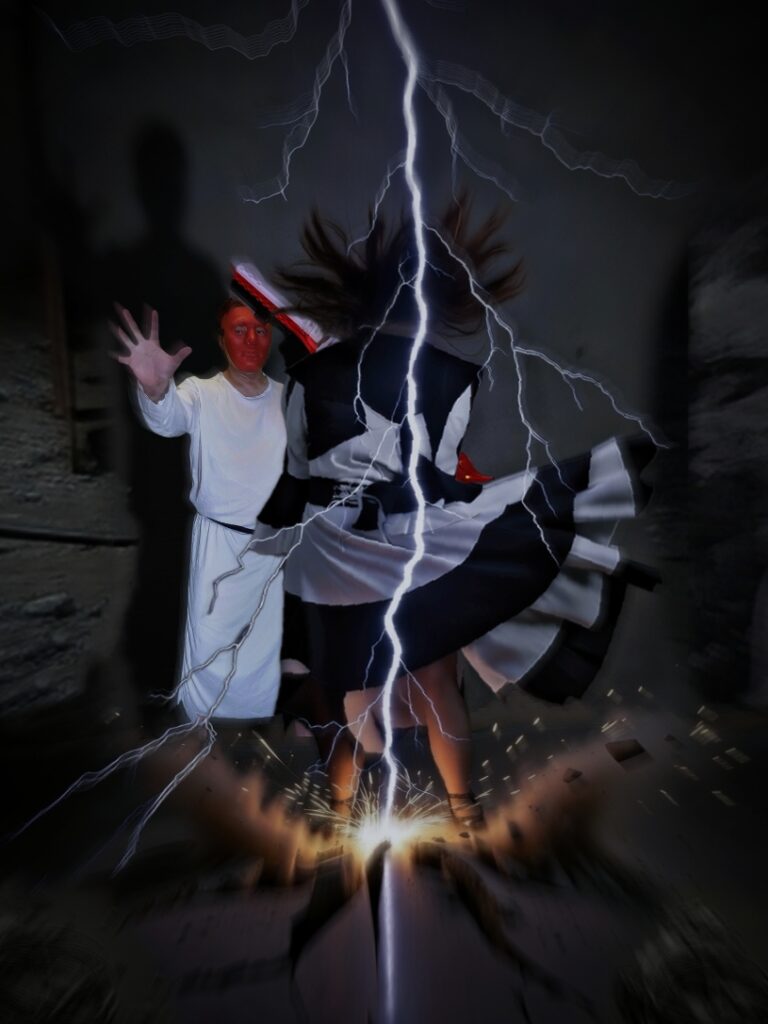 大首領に飛びかかる時女に電撃が直撃!吹き飛ぶ時女…