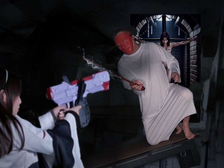 時女のそばに近づくと……無理やり首を掴み吊り上げる大首領!