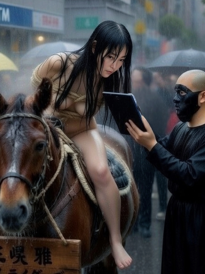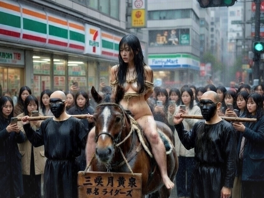 分身Bらに棍棒で叩かれ粛清されると……馬の瀬に倒れ込む月黄泉、そして容赦なく撮影される……